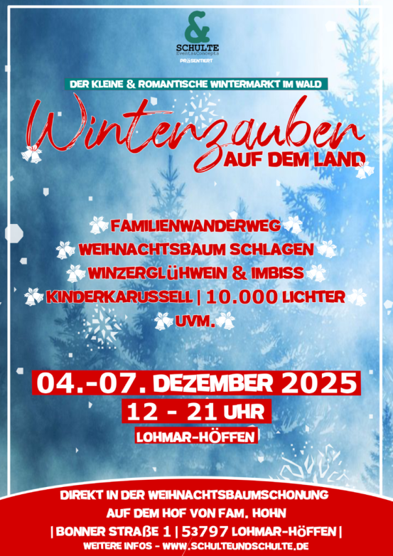 Vom 04. bis 07. Dezember 2025 [4 Eventtage] verwandelt sich die Weihnachtsbaumschonung in einen wundervollen und kleinen Wintermarkt mitten im Wald. Mit ausgewählten Winzerglühweinen und leckeren Speisen aus abwechslungsreichen Foodtrucks aus der Region begrüßen wir alle Familien und Gäste auf dem Hof von Fam. Hohn in Lohmar-Höffen. Über 10.000 Lichter illuminieren den Wald in ein buntes Farbenmeer und ihr lauft über den 500m langen Familienwanderweg durch die Schonung. Zusätzlich habt ihr die Möglichkeit Euch euren Weihnachtsbaum in der Schonung selbst auszusuchen und selbst zu schlagen. Als Highlight steht ein kleines Karussell für die Kinder zur Verfügung. Ein Highlight für die ganze Familie.
